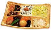 It is made by the basis of peculiar thought of Mr. Hirano known as master of japanese food.It is imagined "OBANZAI" style that is popular in japanese dining restaurant recently.It is combination about the dish,(boiled vegetables, black soybean of TANBA, baked beef with bean paste, boiled edible brown algae, dried slice japanese radish etc...) which has a handmade feeling so that the vitamin mineral which tends to be insufficient for a man of today can be taken with sufficient balance.