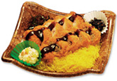 "ZEN lunch box of fillet cutlet and fried cake of minced meat in Hisama style" is 550 yen.A cutlet that made of "stick fillet" and juicy fried cake of minced meat make ussatisfy. And the sauce which added curry by secret seasoning excites appetite.